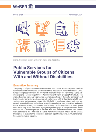 This policy brief proposes concrete measures to enhance access to public services for citizens with and without disabilities in the Republic of North Macedonia (NM). It has been prepared within the Western Balkans Enablers for Reforming Public Administrations— Monitoring of Public Administration Reform project (WeBER 3.0). The methodological framework combines normative analysis of domestic legislation and institutional mechanisms with comparative alignment with United Nations (UN) conventions and jurisprudence relevant to this field. It employs a mixed-methods approach grounded in normative-legal analysis, quantitative benchmarking, and qualitative stakeholder insights. It draws on the analytical findings from the focus group held on 12 May 2025. This brief highlights systemic gaps in the provision of public services for vulnerable groups of citizens with and without disabilities. The framework adheres to the Principles of Public Administration (also known as the SIGMA Principles) to evaluate the coherence between legal frameworks, institutional practices, and inclusive equality. Download the brief here. ENG